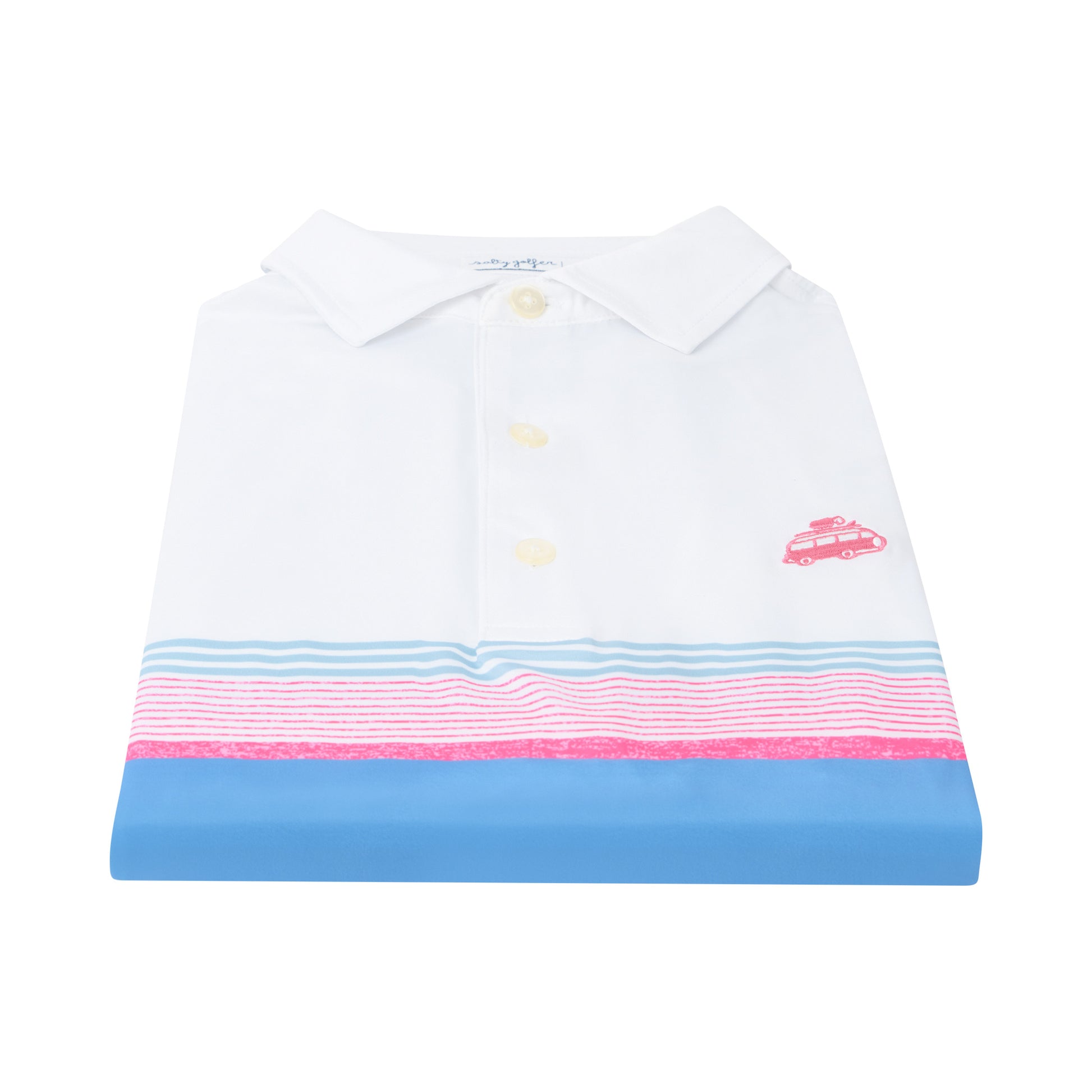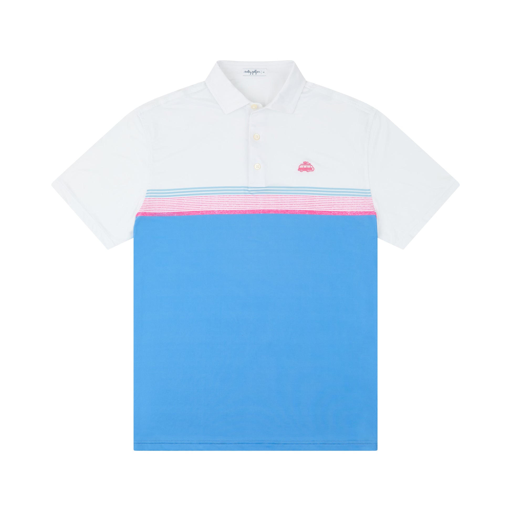 Elevate your golf style with the Retro Lines Polo from The Salty Golfer. Crafted from a comfortable blend of polyester and spandex, this polo offers flexibility and breathability on the course. Its crisp white base features striking blue, pink, and light blue/grey lines, with the pink lines subtly distressed for a vintage touch. The iconic bus logo is embroidered with exceptional detail, adding a unique flair. Available in sizes small to 3XL, this polo combines classic design with modern comfort to keep you looking sharp and feeling great every round.
