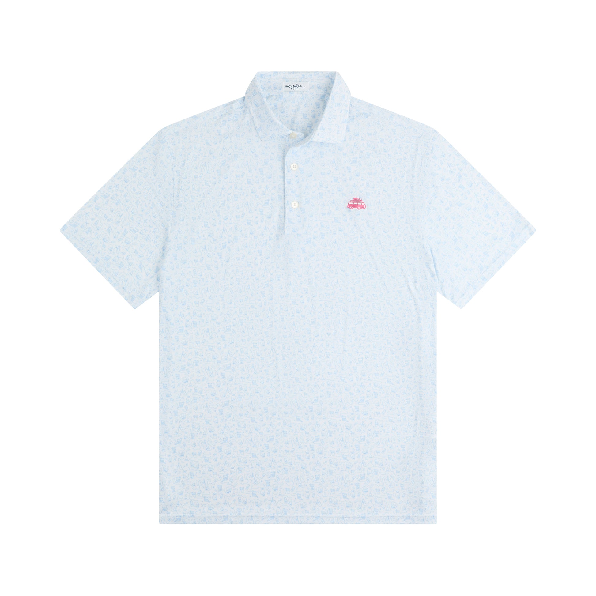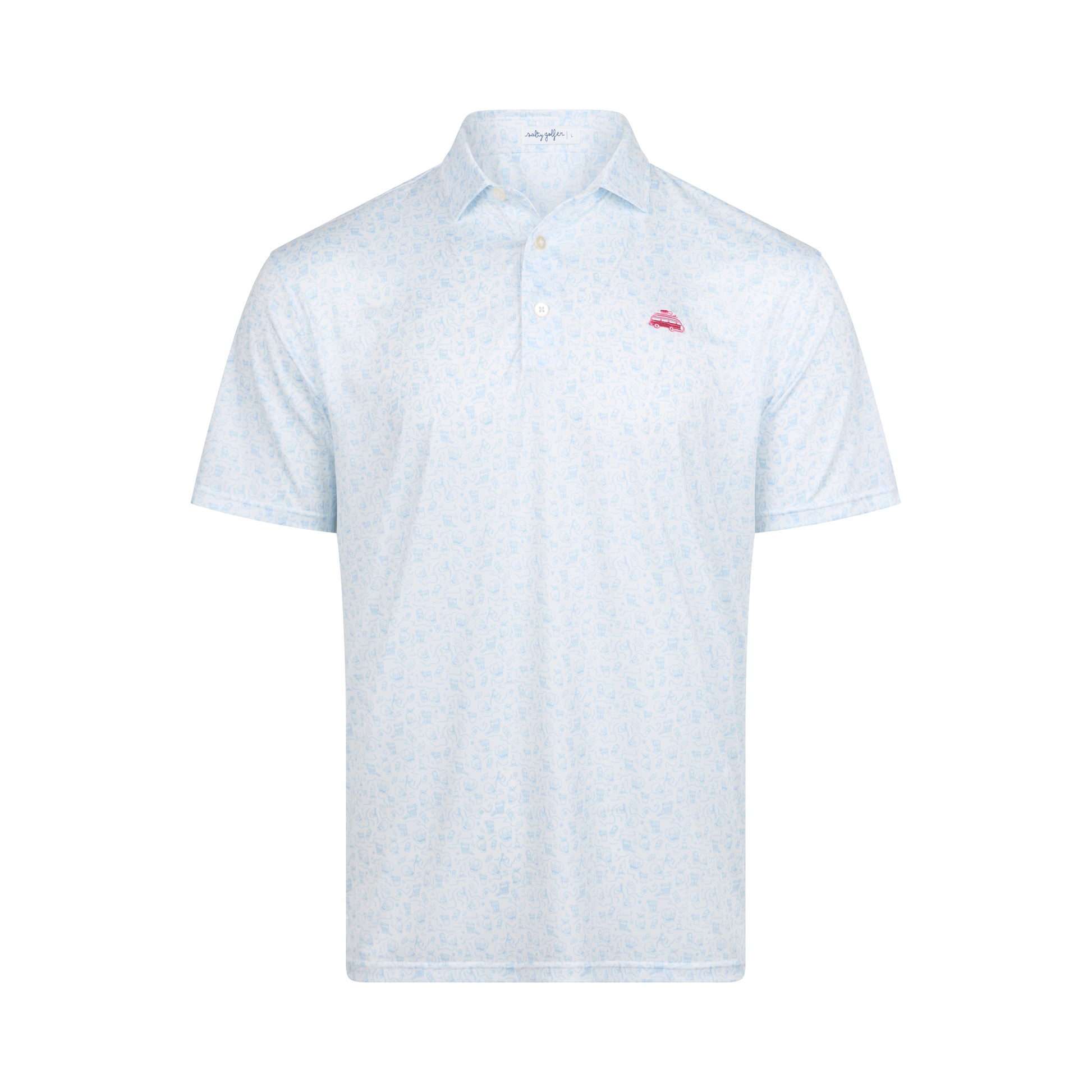 Experience comfort and style with the Skullarita Polo White. Crafted from a lightweight polyester-spandex blend, this moisture-wicking polo keeps you cool and dry whether you're on the golf course or out with friends. Featuring a playful design of dancing skulls with margaritas, it adds a fun, unique touch to any occasion. Perfect for those who want performance and personality in one shirt.